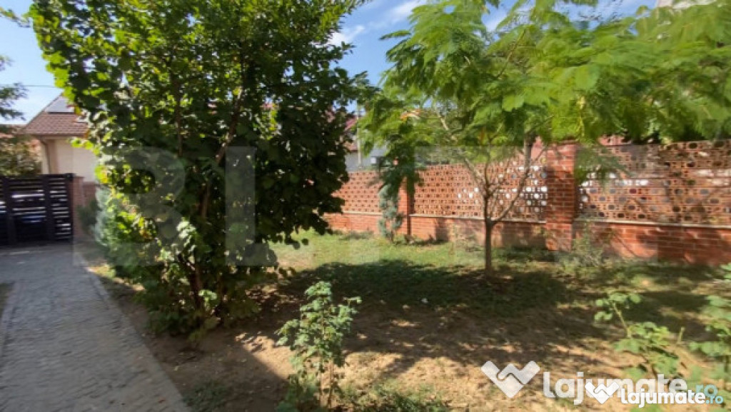 Terenul are o suprafață de 370 mp cu o deschidere de 10,3 m. Curtea este amenajata cu alee, gazon, plante ornamentale, iluminat ambiental, poarta automata, priza incarcare masina electrica si gard din beton cu aspect de caramida.