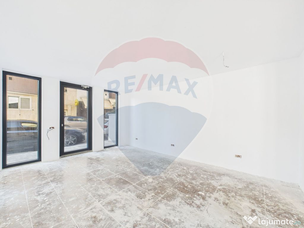 Vitrina stradala: Fatada este formata din multiple ferestre si usi vitrate (cu tamplarie de culoare neagra, moderna), oferind o expunere excelenta pentru branding si lumina naturala abundenta.
