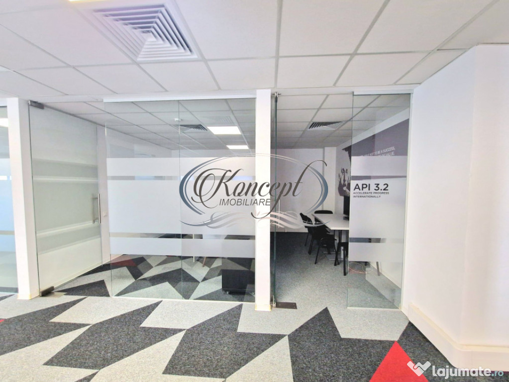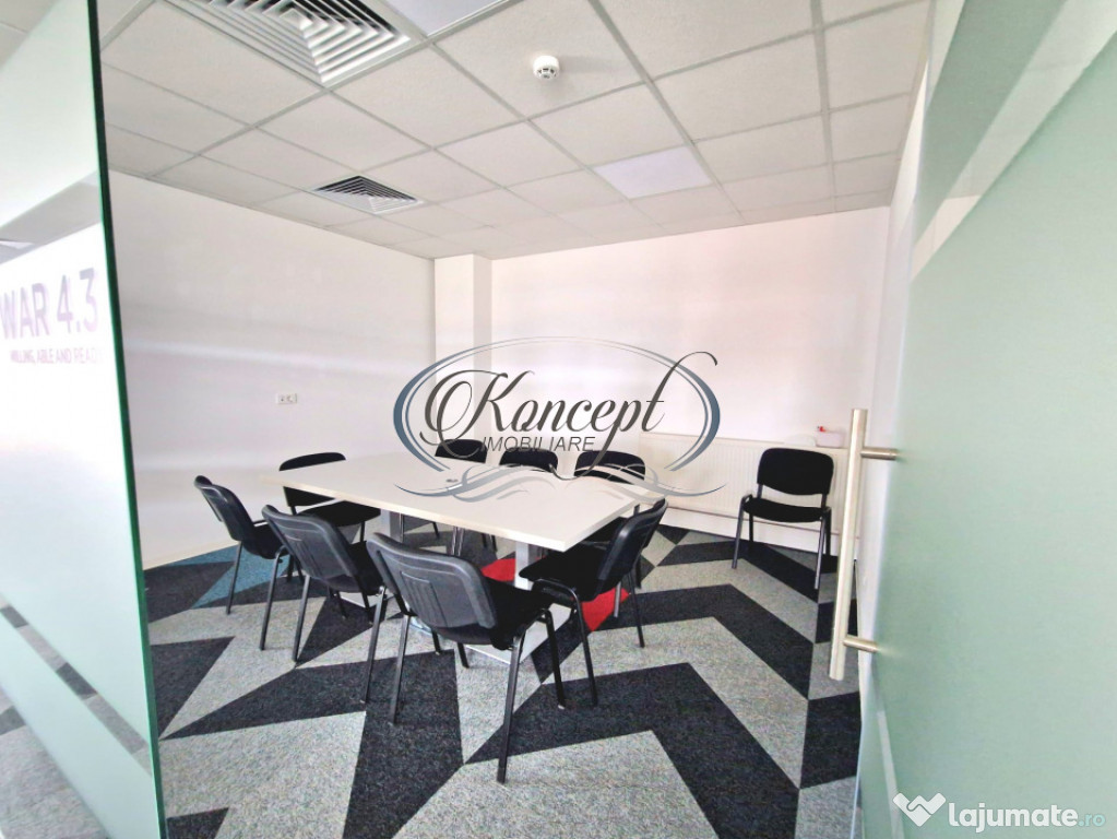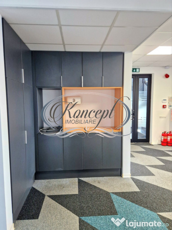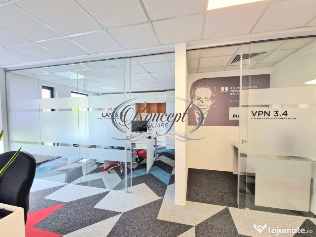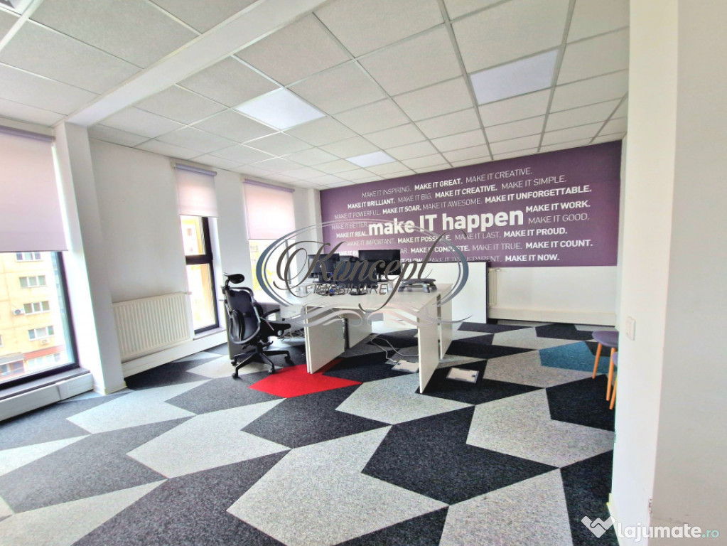 Koncept Imobiliare ofera spre inchiriere un spatiu de birouri situat in cartierul Marasti, pe strada Bucuresti, in imediata proximitate a zonei comerciale Kaufland. Amplasat la etajul 4 al unei cladiri moderne, cu acces pietonal si auto facil, imobilul beneficiaza de 6 locuri de parcare proprii – un avantaj important pentru companiile care apreciaza confortul operational si accesibilitatea urbana. Spatiul are o suprafata utila de 241 mp si este configurat in regim open-space, cu 4 incaperi partial compartimentate si 2 grupuri sanitare. Designul versatil permite recompartimentari in functie de nevoile chiriasului, oferind libertate in organizarea fluxului de lucru. Terasa de 8 mp adauga un plus de functionalitate si poate fi inchiriata separat. Finisajele moderne si dotarile complete transforma acest birou intr-un spatiu “la cheie”: mobilierul este inclus, sistemul de ventilatie permite reglarea temperaturii (aer cald / rece), iar inaltimea interioara de 2.9 m si aportul generos de lumina naturala asigura un ambient optim pentru activitati profesionale. Sistemele de alarma, supraveghere video si acces pe baza de cartela intaresc nivelul de siguranta si control. Ideal pentru firme din domeniile contabilitate, arhitectura, IT, consultanta sau alte servicii business, acest spatiu reprezinta un mix echilibrat intre functionalitate, confort si reprezentativitate. Disponibil imediat si cu documentatia juridica validata de agentie, este pregatit pentru ocupare. Pentru informatii complete, programarea unei vizionari sau pentru a afla oferta noastra completa va stam la dispozitie telefonic, prin e-mail sau la sediul agentiei noastre, pe str. Aviator Badescu, nr. 19, Cluj-Napoca.Id intern: P20866