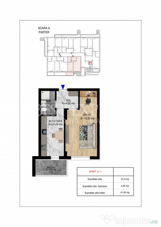Suprafata utila -37.00 mp utili +.4.55 mp balcon, Suprafata totala utila 41.55 mp