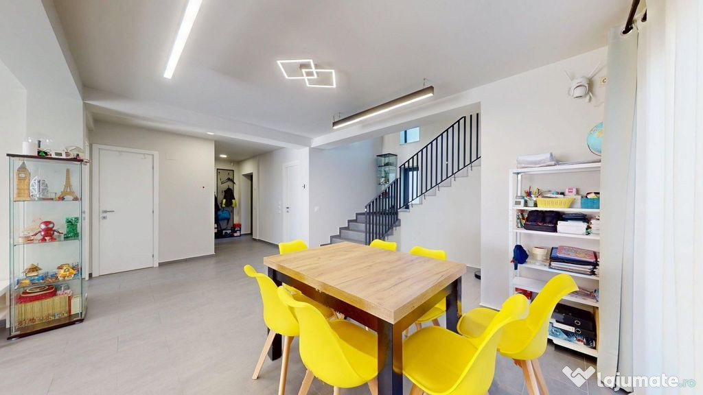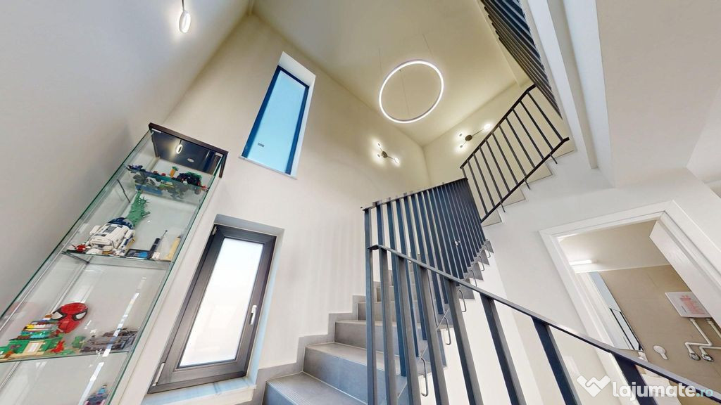 Designul îmbină elemente minimaliste și elegante – riflaje și balustrade metalice, placări în tonuri naturale, uși Benati albe, corpuri de iluminat LED.