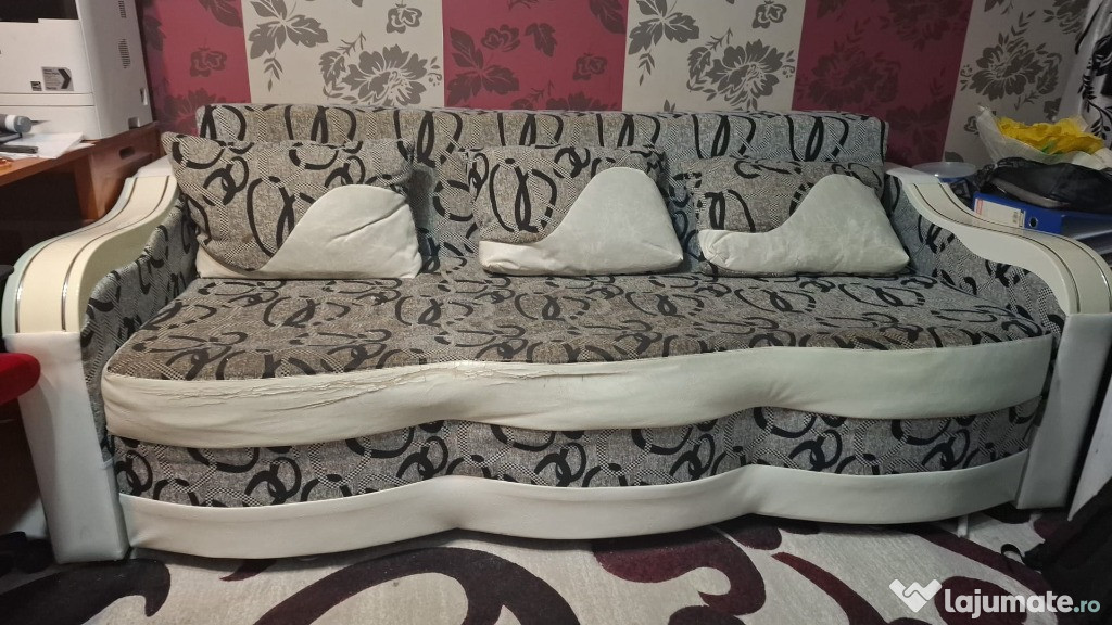 Canapea de sufragerie elegantă, cu design floral în nuanțe de gri și alb. Tapițeria este în stare bună, iar pernele decorative adaugă un aspect folosit.Prezintă urme de folosire in partea de exterior (unde se preseaza la asezarea unei persoane). Daca se foloseste cu husă, nu este nicio problemă. Se poate extinde, nu prezintă probleme la dormit.