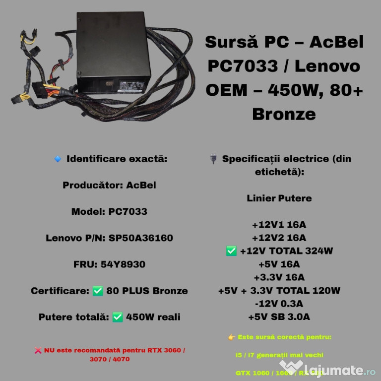 Doresc sa vand acest produs pentru ca mi-am facut upgrade la pc la un rtx 4070 12 gb vram, si a trebuit o sursa mai puternica, am luat una de 850 sa fie future proof. Insa pentru un build mai vechi,de exemplu pentru a juca pubg, dead by daylight, gta v,sims,minecraft, impreuna cu o placa gtx 960 , isi face treaba foarte bine pentru un pret foarte mic! Insa daca doresti sa te joci the last of us iti va da crash jocul.