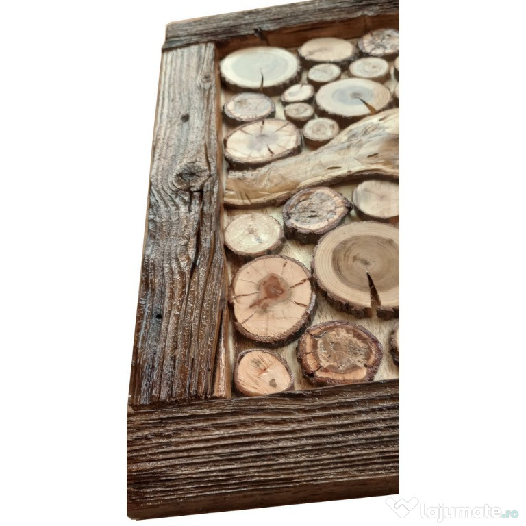 Anuntul Tablou rustic handmade din rondele de lemn, rama arsa, lacuita este adaugat de pe LaJumate.ro.