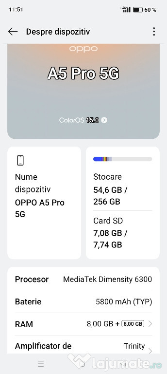 Vând telefon Oppo A5 Pro 5g.Are folie de sticla pe ecran.Este model 2025.Nou.Functioneaza ireproșabil.Anuntul Telefon Oppo A5 Pro 5G este adaugat de pe LaJumate.ro.