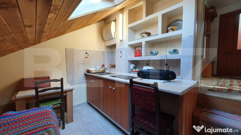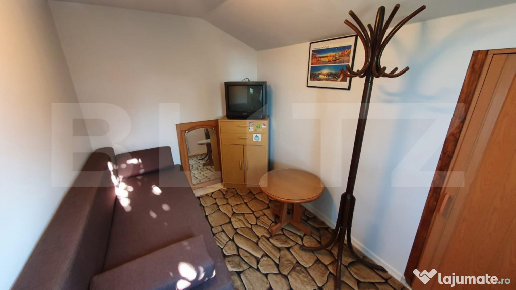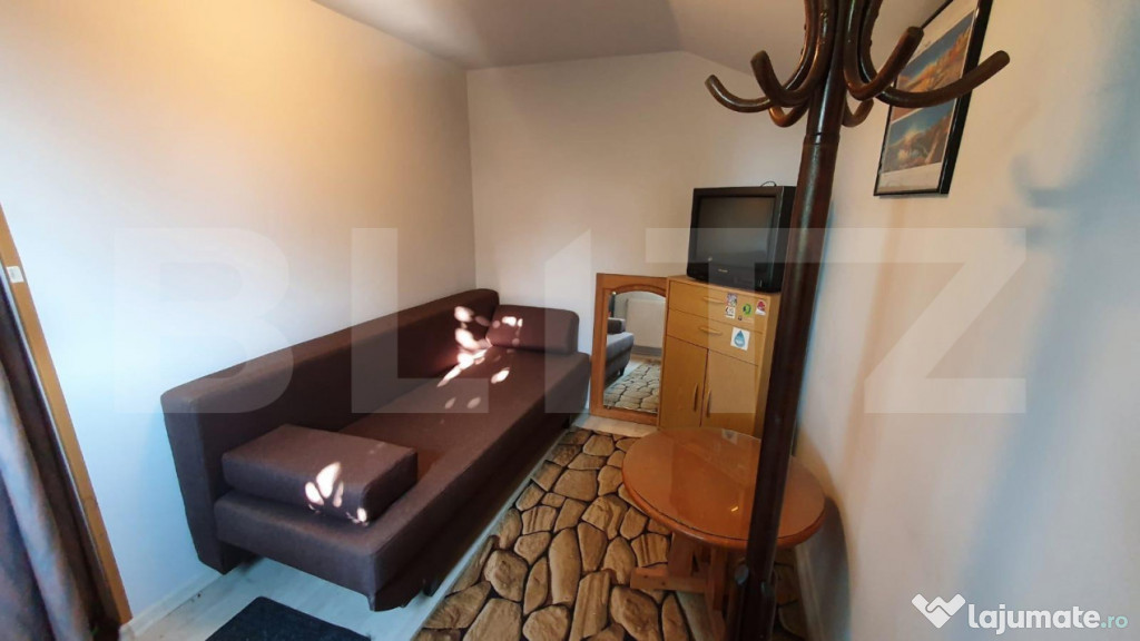 Blitz ofera spre inchiriere un apartament de 1 camera, situat in zona strazii Ariesului, cartierul Gheorgheni. In proximitatea zonei exista acces pentru supermarket-uri, mijloace de transport in comun, restaurant, parcuri etc.Acesta este pozitionat la mansarda unei case si dispune de o suprafata utila de 35 mp. Compartimentarea apartamentului este decomandata si dispusa astfel: living cu nisa de dormit, bucatarie, baie si hol. Apartamentul se ofera spre inchiriere complet mobilat si utilat. Apartamentul beneficiaza si de o curte comuna.