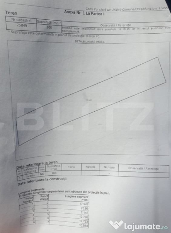 BLITZ va propune spre vanzare un teren extravilan la limita intravilanului, de 300mp(3 ari) cu cabana de lemn de 15 mp,terasa,gratar,si toaleta ecologica.Proprietatea este imprejmuita in totalitate,si are pomi fructiferi pe rod,frontul stradal este de 8m,cu utilitatile necesare la frontul stradal.