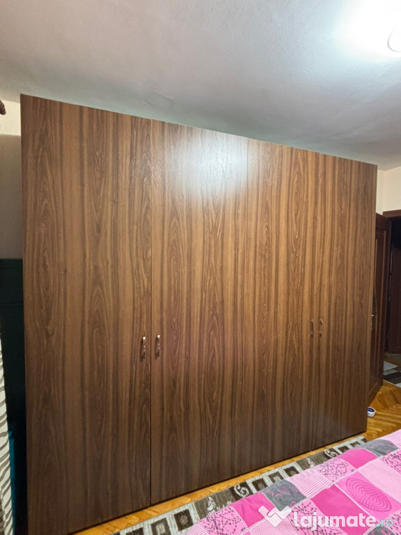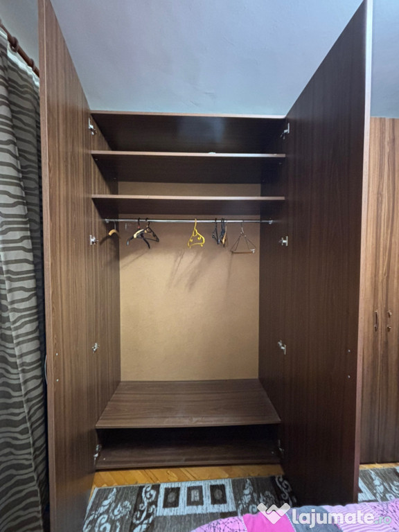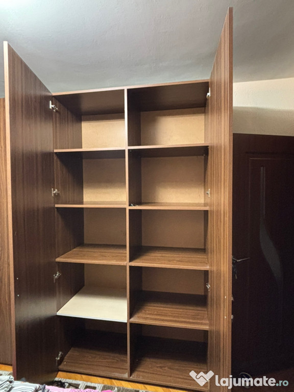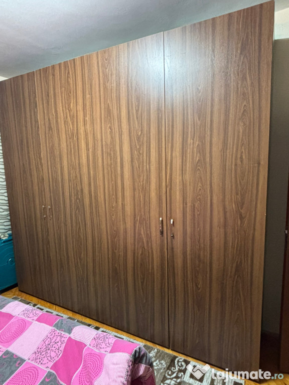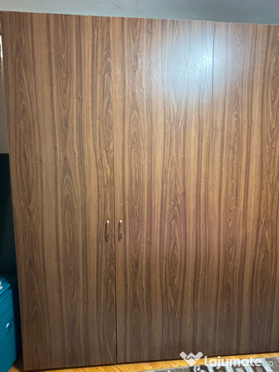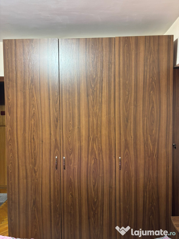 Vând set complet dormitor, culoare wenge, compus din:• Dulap 1: cu bară pentru agățat haine, 2 polițe sus + 1 poliță jos. Dimensiuni: H 227,5 cm x L 125 cm x A 53,5 cm.