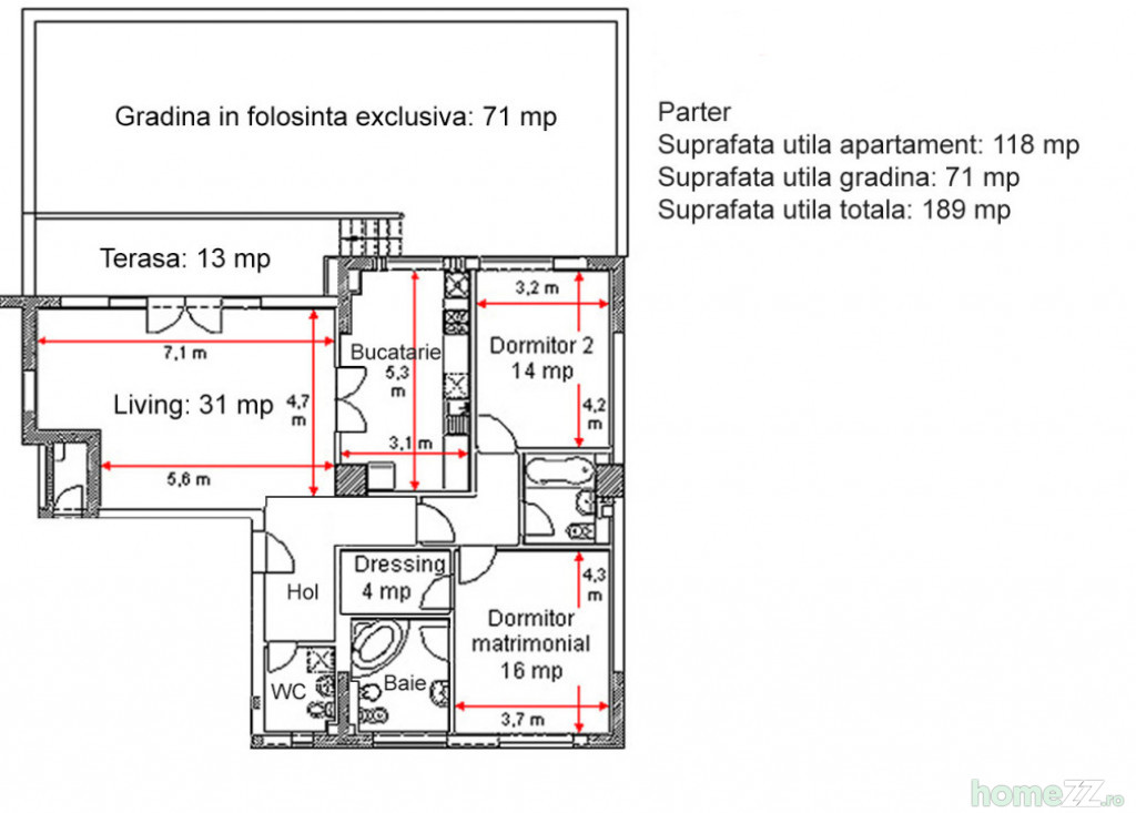 Suprafață totală de 189 m.p, din care suprafața utilă este 118 m.p, curte 71 m.p.
