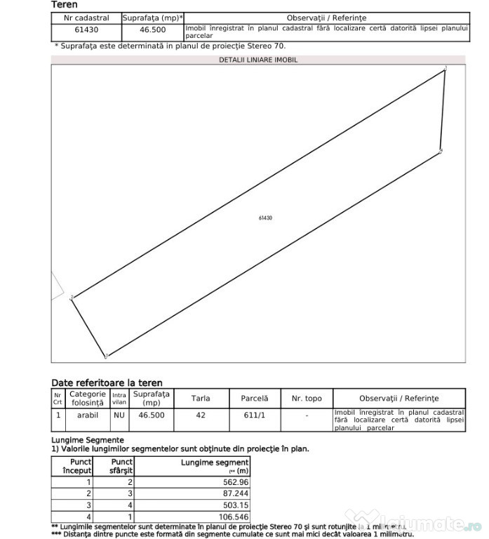 Teren agricol, cu suprafata de 4.65 hectare, situat in extravilanul comunei Sipote, Jud Iasi. Acces facil, de la strada asfaltata ( DJ281B), aproximativ 1.5 km de la drumul judetean. Pretul terenului este de 27900 euro , 6000 euro/Ha.Anuntul Teren extravilan agricol Sipote, Jud Iasi, 46500 mp este adaugat de pe LaJumate.ro.