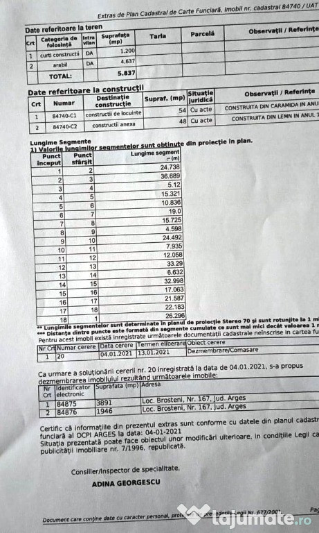 Persoana fizica vand teren intravilan 5,837 mp, parcelat in 2 buc cu 2 cadastre 3,891 mp si 1,946 ...