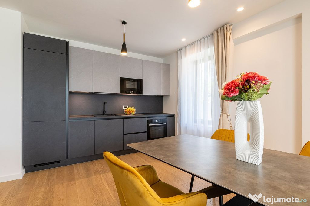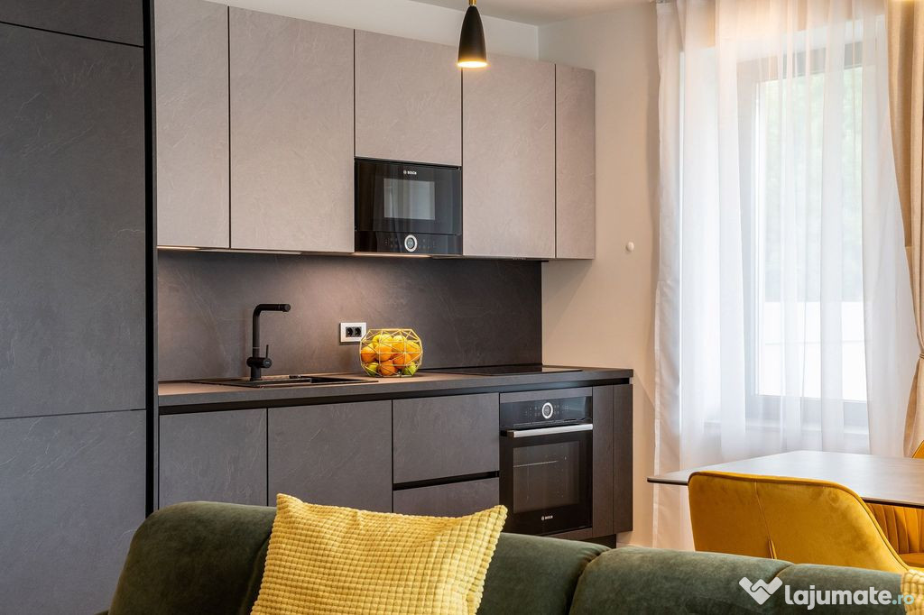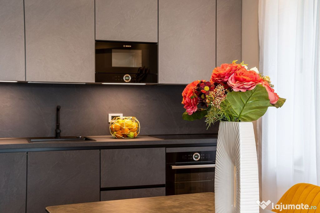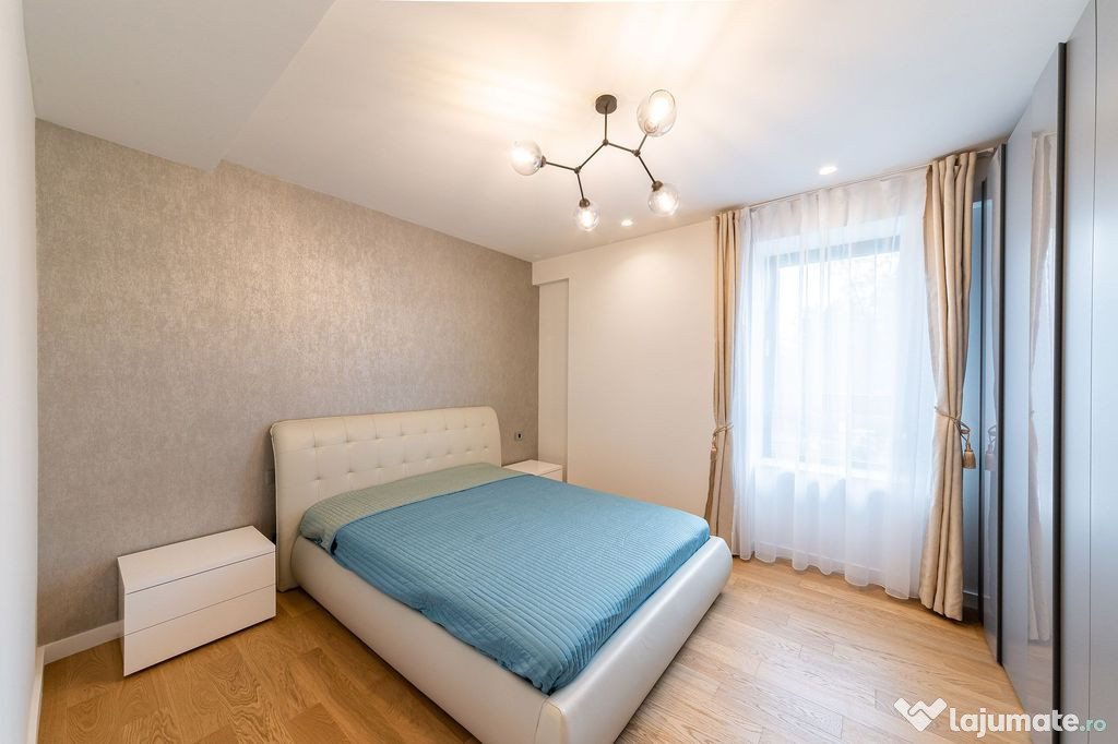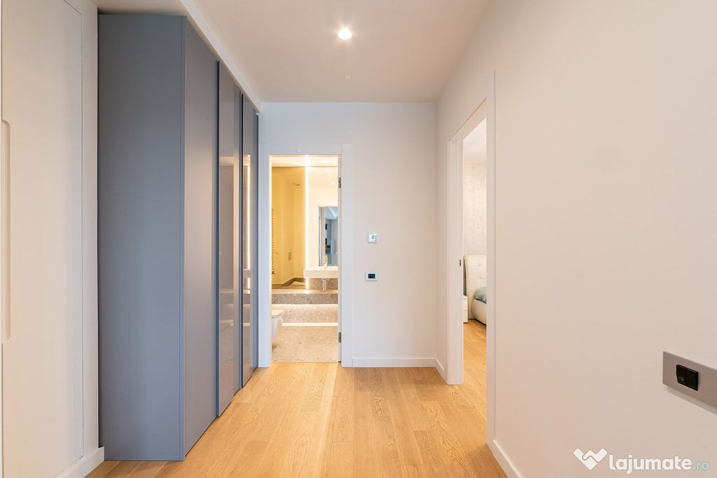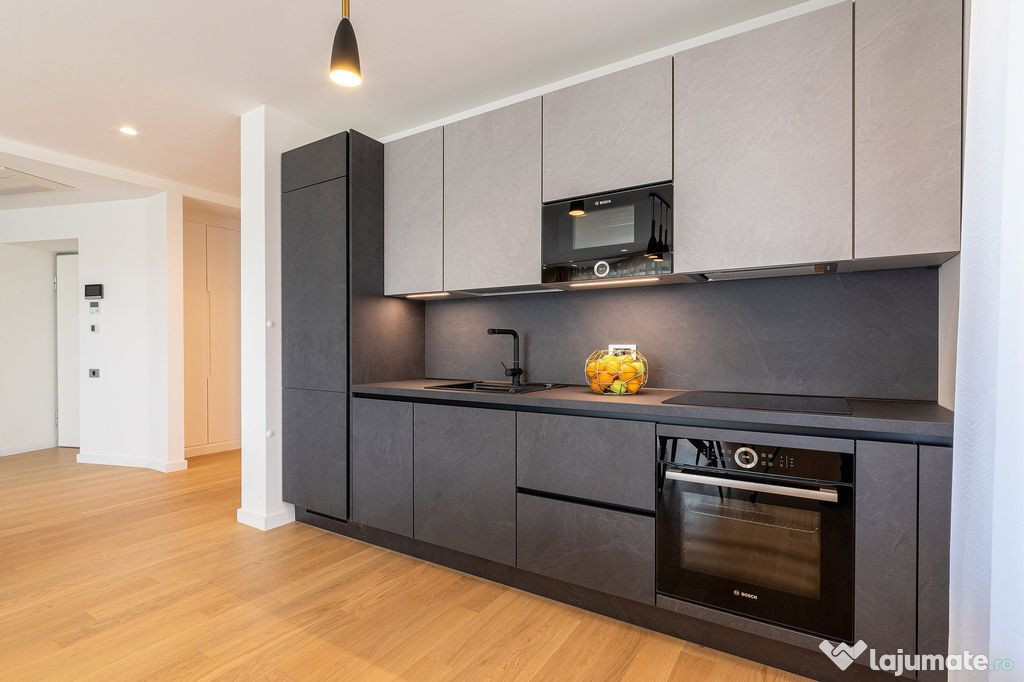 Este utilat complet (frigider, masina de spalat vase, plita cu inductie, cuptor electric, hota, cuptor cu microunde, toate marca Bosch precum si o masina de spalat rufe) si dispune de un dressing spatios in dormitor si unul pe hol.