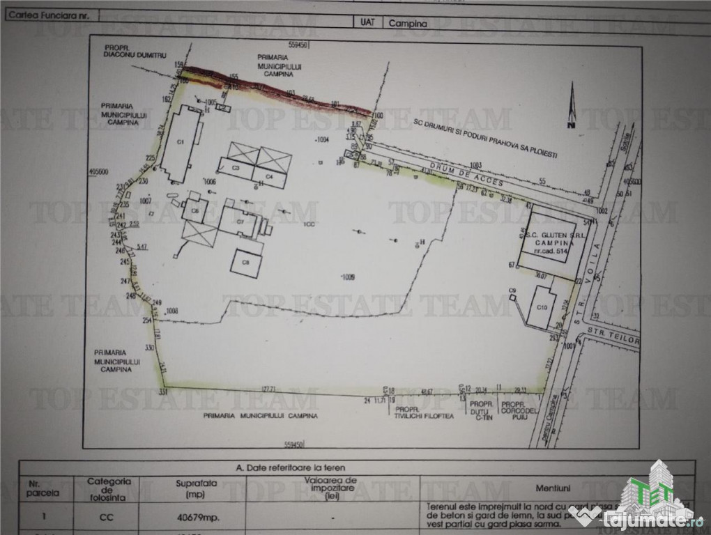 Terenul este imprejmuit cu gard si include cateva constructii demolabile cu suprafata construita de 2222 mp.