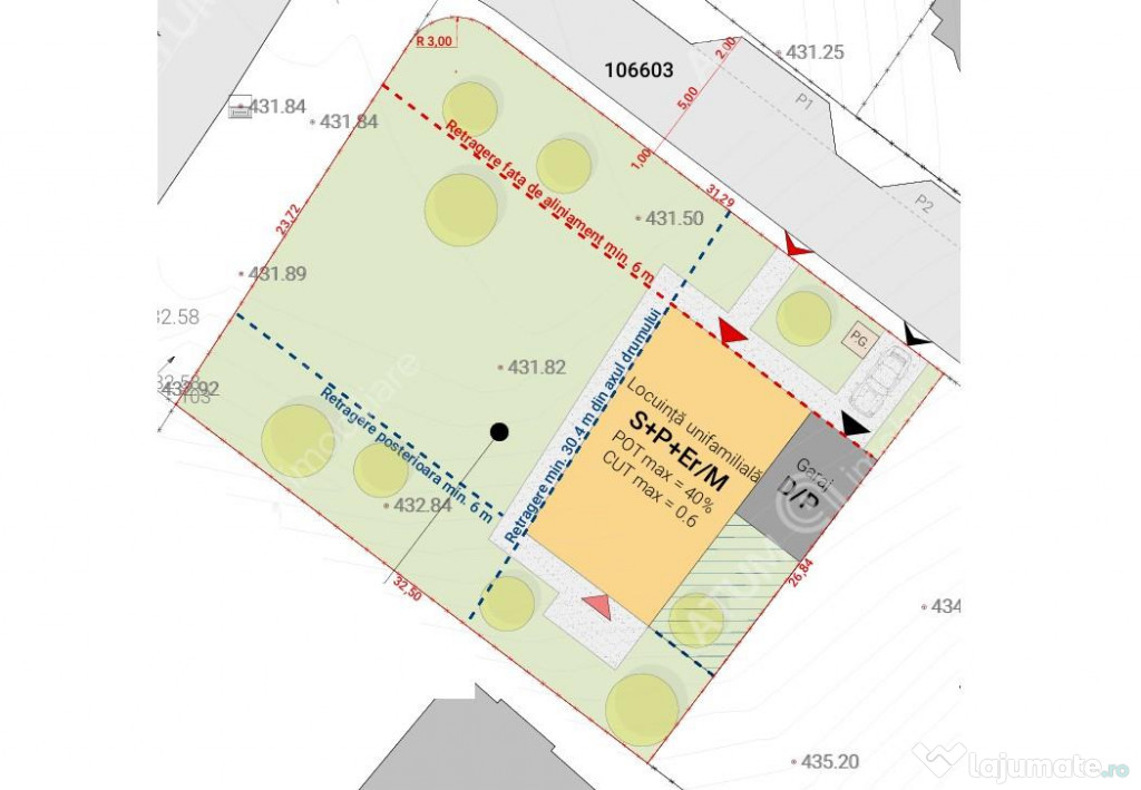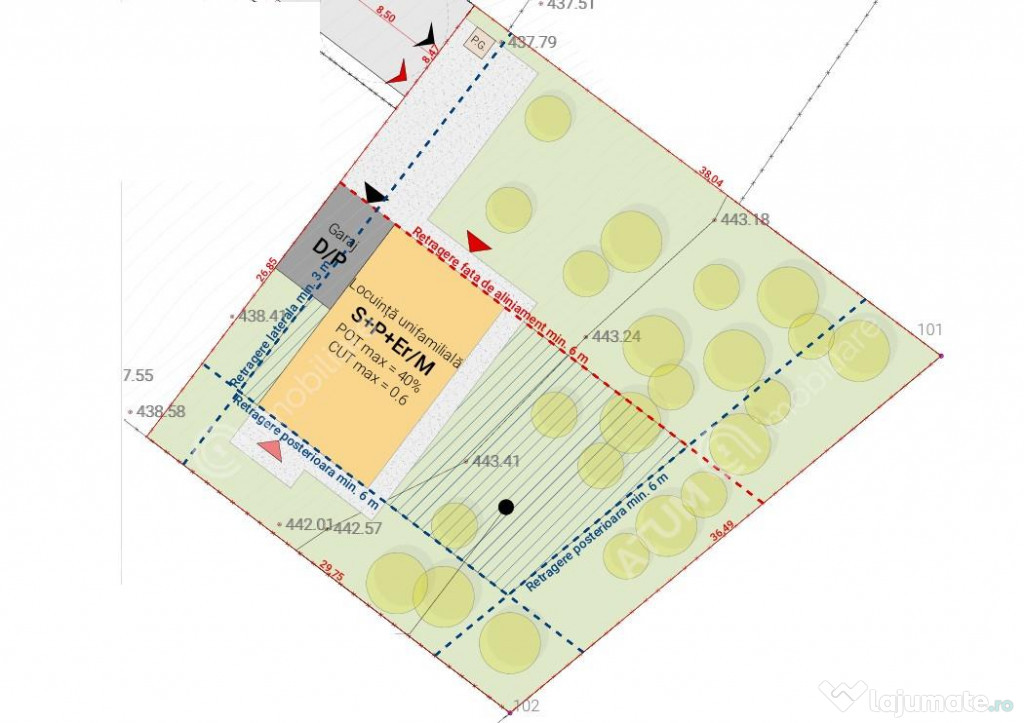 In conformitate cu indicii urbanistiti din Certificatul de Urbanism fiecare parcela suporta un Procent de Ocupare ( POT ) de 40% si un Coeficient Maxim de Utilizare ( CUT ) 0,6%.
