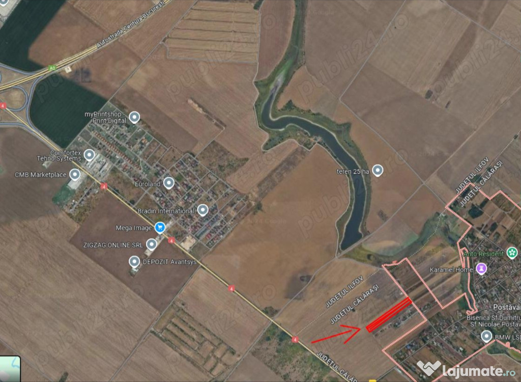 Vand teren extravilan Postavari, Calarasi. Suprafata totala de 4200 mp cu deschidere de 11 m si lungime de 380 m. Terenul este situat paralel cu DN4 la 15 minute de Bucuresti, 5 km de centura A0 si 8 km de centura veche. In apropiere sunt ansambluri rezidentiale, fiind prima localitate dupa Bucuresti, la iesirea din Ilfov si intrarea in Calarasi.Zona linistita pentru cine doreste o casa la curte fiind de asemenea potrivit si pentru activitati economice: depozite, hale, parcuri logistice