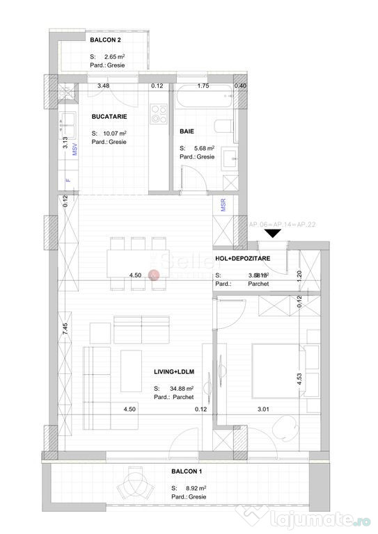 - Bucataria, de tip open space, cu deschidere la balcon;
