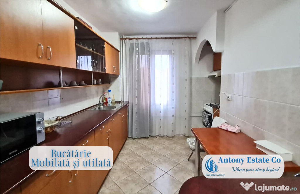 Proprietarul pune la dispozitie viitorului nou chirias urmatoarele utilitati: cuptor si plita, microunde, frigider, masina de spalat rufe, 2 TV-uri si intregul mobilier ce se vede in poze.