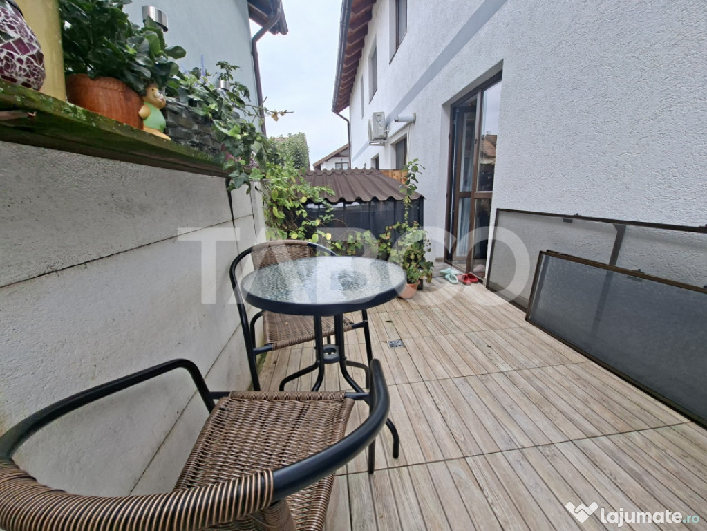 TABOO Imobiliare propune un apartament de vanzare cu 3 camere, decomandat, situat in localitatea Sibiu, zona Calea Cisnadiei - Arhitectilor, aflat la etajul P intr -un imobil tip bloc cu regim de inaltime pe Parter + 1 Etaje; anul constructiei 2015, structura caramida. Suprafata utila de 67 mp + balcon de 6 mp, terasa de 23 mp sub care se afla o pivnita de depozitare.