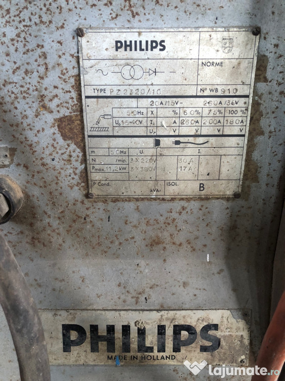 Vând aparat de sudura Philips, industrial, calitate garantată, Made in Holland. E un aparat ce poate funcționa 24/24h pentru asta a fost proiectat. La mine de câțiva ani sta mai mult degeaba. Este foarte puternic, pana la 11,2kw putere, pentru Suduri serioase și de calitate dar și pentru lucruri finite, tabla auto de 1mm merge impecabil. Stabil, fără probleme. Aveți specificațiile in poza cu plăcuta tehnica.Se poate alimenta atât trifazat cât și monofazat, foarte versatil!