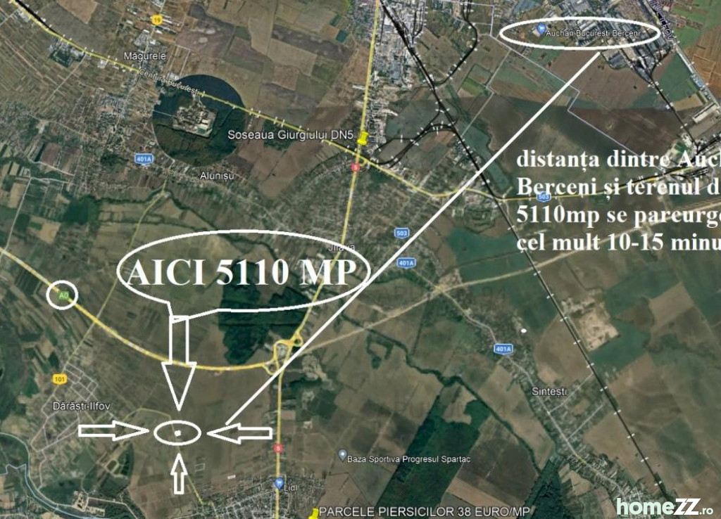 Vă propun un teren de colț, cu două frontrui stradale, un front stradal la un drum principal de peste 40ml si un al doilea front stradal la un drum secundar neamenajat de peste 100ml. La nici 14 minute de București, spre Giurgiu, langa Inelul de Centura A0 (Centura a doua a Bucureștiului) avem un teren perfect pentru un mic centru logistic sau un proiect frumos. Terenul este cu front stradal direct la drumul principal ce leagă localitățile 1 Decembrie și Dărăști din județul Ilfov (DJ 401). Frontul stradal este de 41ml pe un tronson de drum care beneficiază de iluminat public stradal. Terenul este compact, proprietarii sunt persoane fizice si tranzactia nu implică TVA. Documentele sunt la zi, avem cadastru, intabulare si documentația cadastrală aferentă. Utilitățile nu sunt la distanță mare. Accesul la teren se poate face ușor fie din A0 coborând la 1 Decembrie pe Soseaua Giurgiului, fie din București pe ieșirea spre Giurgiu (tot Șoseaua Giurgiului) sau prin Măgurele prin Dărăști. Este un teren bine amplasat, o investiție sigură la un preț bun, un teren unde puteți dezvolta frumos orice proiect.Anuntul Teren, 5110 m² este adaugat de pe HomeZZ.ro.