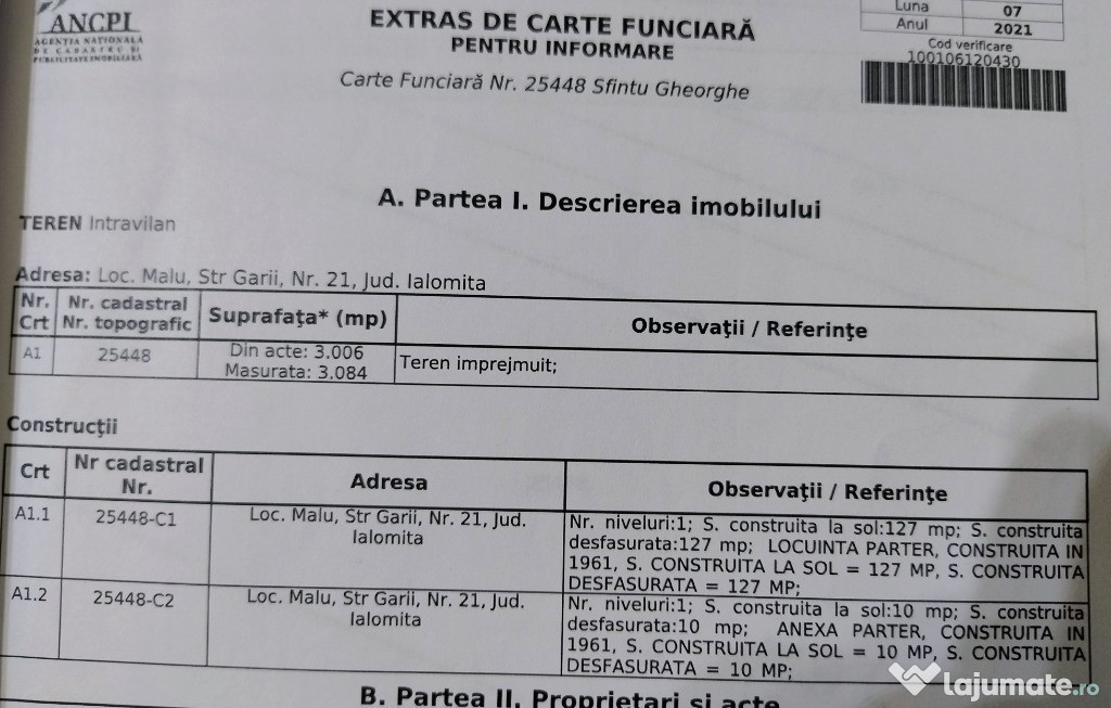 Casa este construita in anul 1961 din cărămidă arsă și are o suprafață de 127 mp dispunând de 5 camere dintre care una este complet renovata iar în alta mai trebuie montat doar parchetul. Una dintre camere a fost utilizată drept bucătărie dar fiind mare poate fi amenajată și transformata in living. Casa dispune de baie cu wc, duș și boiler electric fiind racordată la rețeaua de apă stradală. Dispune de asemenea de fântână și fosa septica de dimensiuni mari. Curtea, în suprafață totală de 3084 mp, este îngrijită și are deschidere la 3 străzi. Terenul poate fi parcelat in 4 chiar 5 loturi. In curte sunt construite câteva anexe care pot fi folosite ca adăpost pt păsări, magazie de lemne, etc. Strada Gării, pe care se face accesul în curte, este asfaltata. Fotografii suplimentare disponibile la cerere. Preț 25.000 Euro. Tel. ascuns dupa ora 17.00.