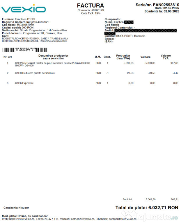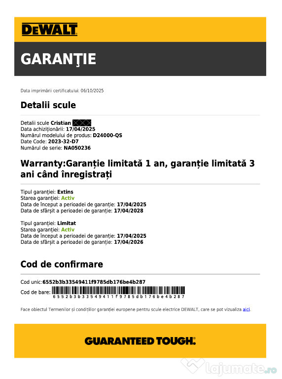 Masina de taiat in mediu umed cu disc diamantat Dewalt D24000, 1600 W, diametru disc 250 mm, pentru marmura, granit si placi ceramice. A fost achizitionata in data de 17-04-2025, insa nu a fost folosita. Nu ofer transport, se ridica direct de la noi. Pot atasa un video cu functionalitatea ei. Are garantie extinsa.Caracteristici:
