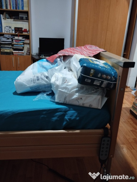 Vând pat spital electric, cu saltea ortopedica, cu telecomanda 5 funcții, aproape nou. Ofer prin donație pampersi, pampersi chiloței, și traverse. Preț 3000 de lei.Detalii și contact la nr de telefon ascuns