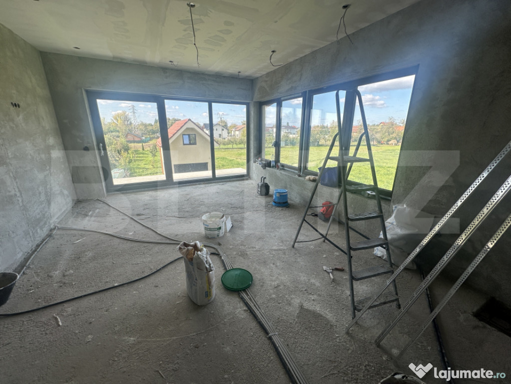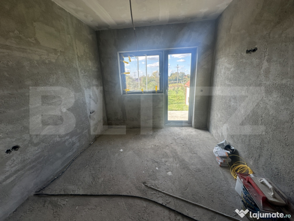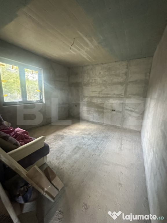 Construcția este realizată integral din cărămidă, cu planșee din beton atât la parter, cât și la etaj, ceea ce oferă un plus de durabilitate și siguranță. Casa este semifinisată, fiind gletuită în totalitate, cu încălzire în pardoseală – un element de confort modern, ideal pentru sezonul rece.