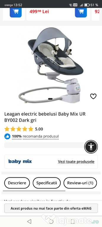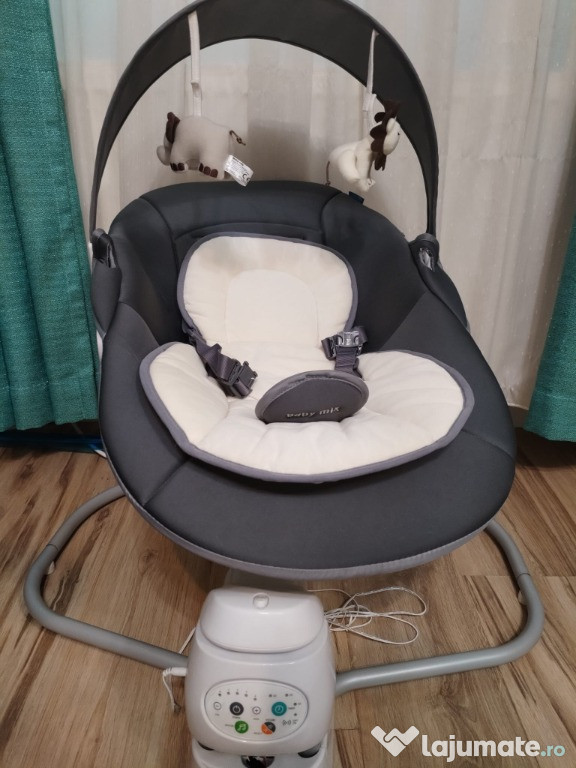 Leagănul funcționează perfect, are viteze de legănare reglabile, jucării suspendate și husă confortabilă.