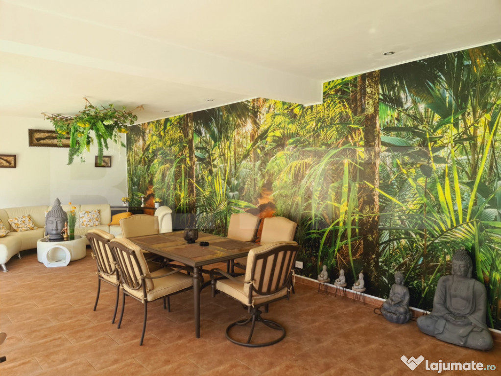 Curte amenajată cu spațiu verde, terasă exterioară și zonă de relaxare;