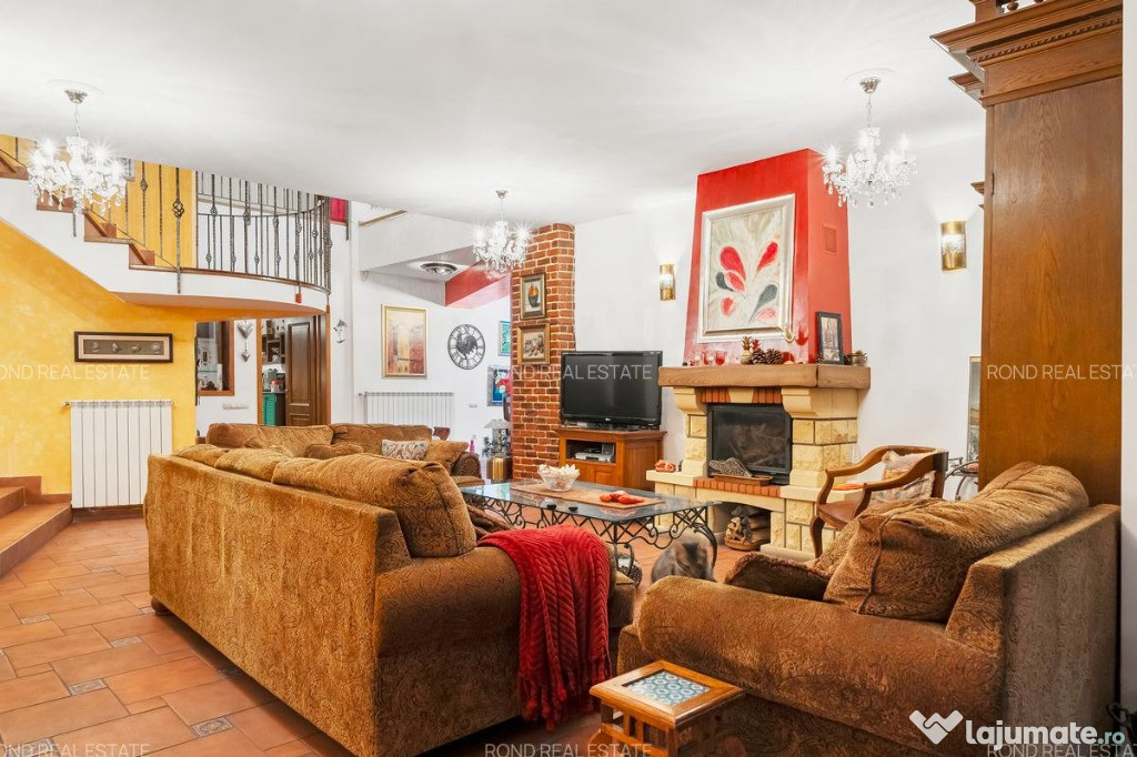 • Living spectaculos in suprafata de 77mp, cu înălțime dublă și ferestre panoramice, ce oferă vedere directă către piscină și pădure, cu șemineul Seguin din piatra de Dordogne.