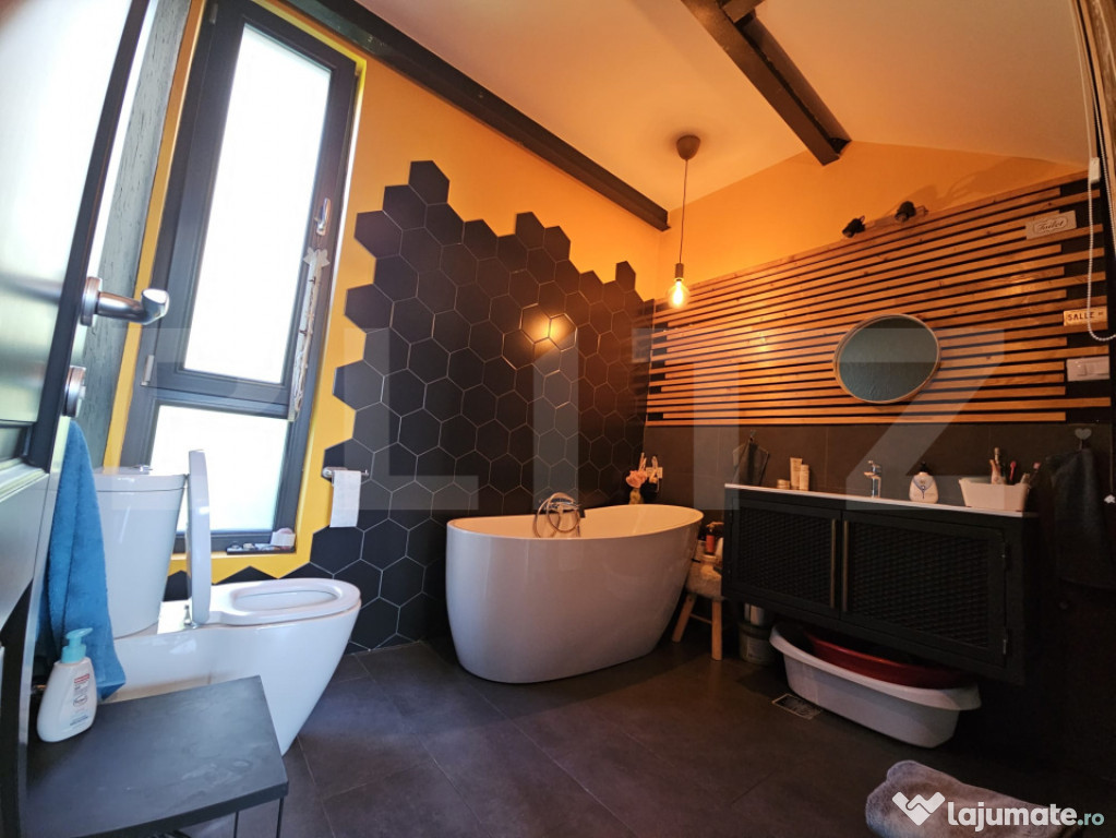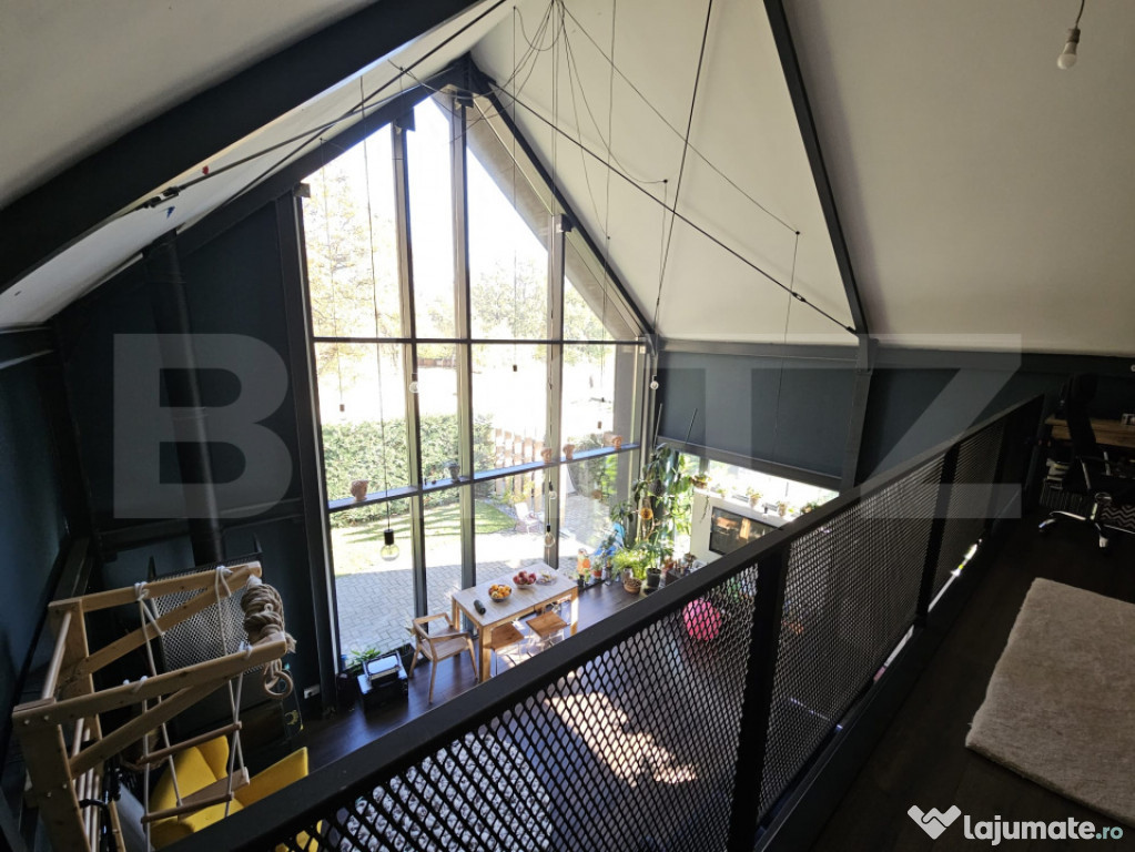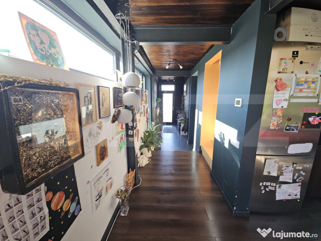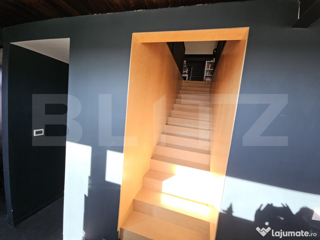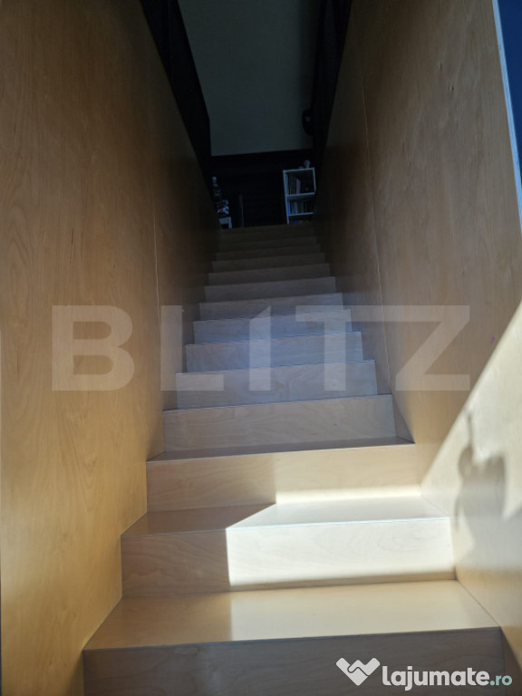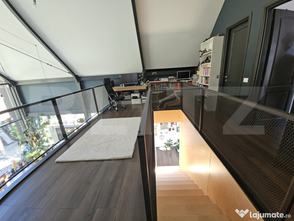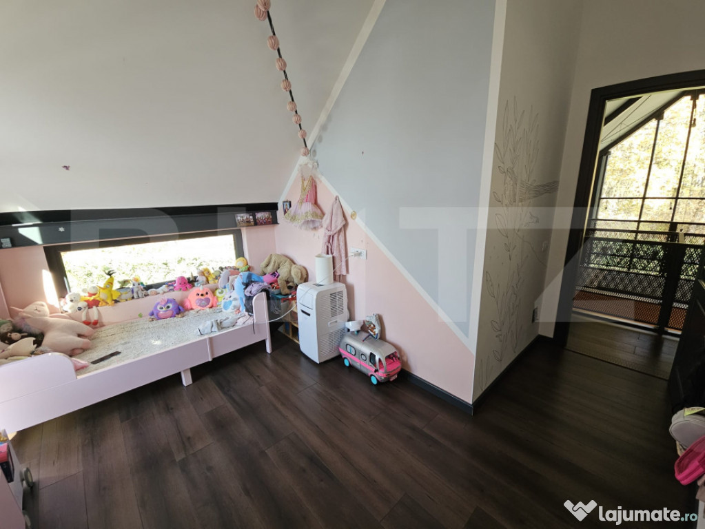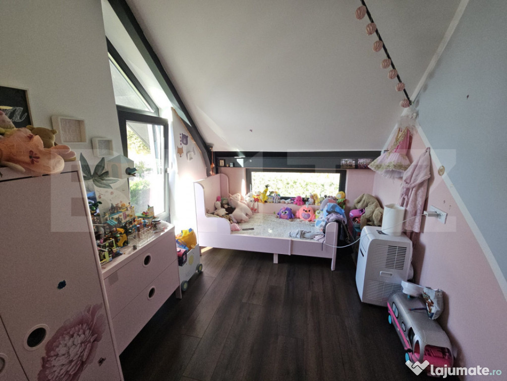 Etaj - spatiu deschis amenajat ca un birou, 2 dormitoare folosite de copii, baie cu geam.