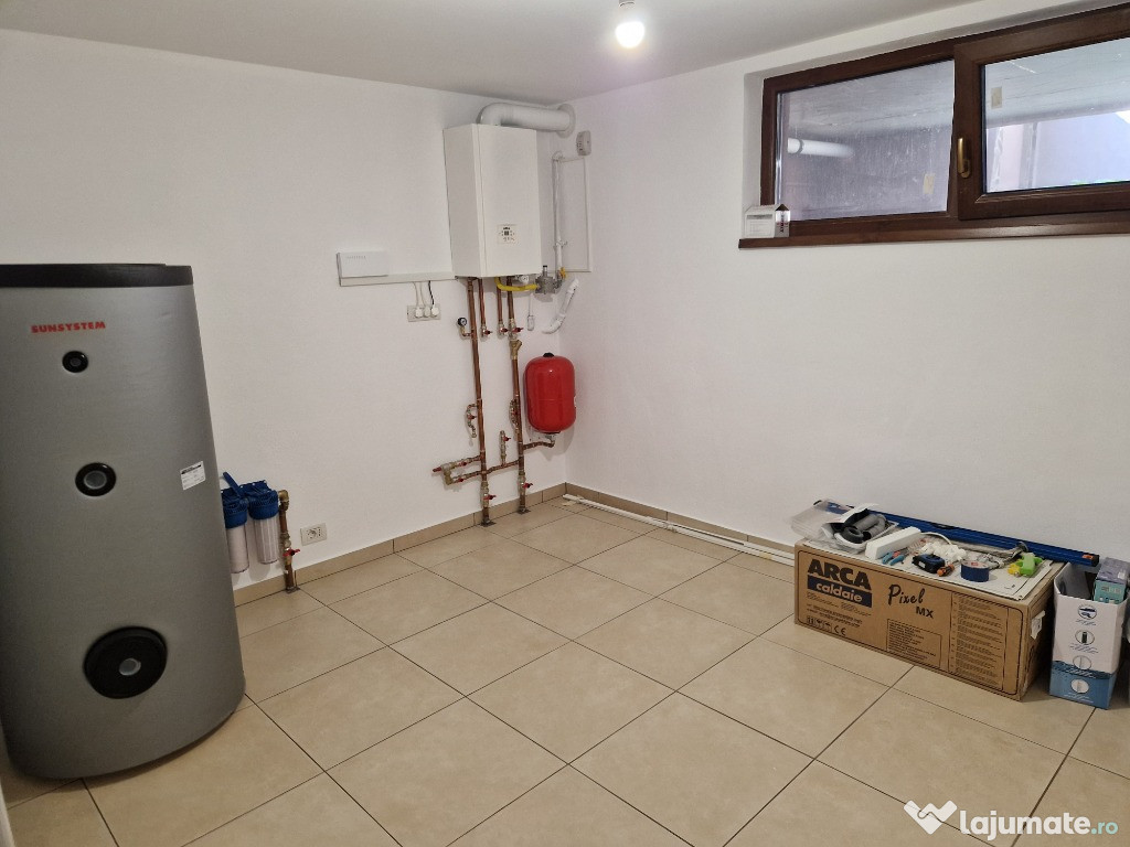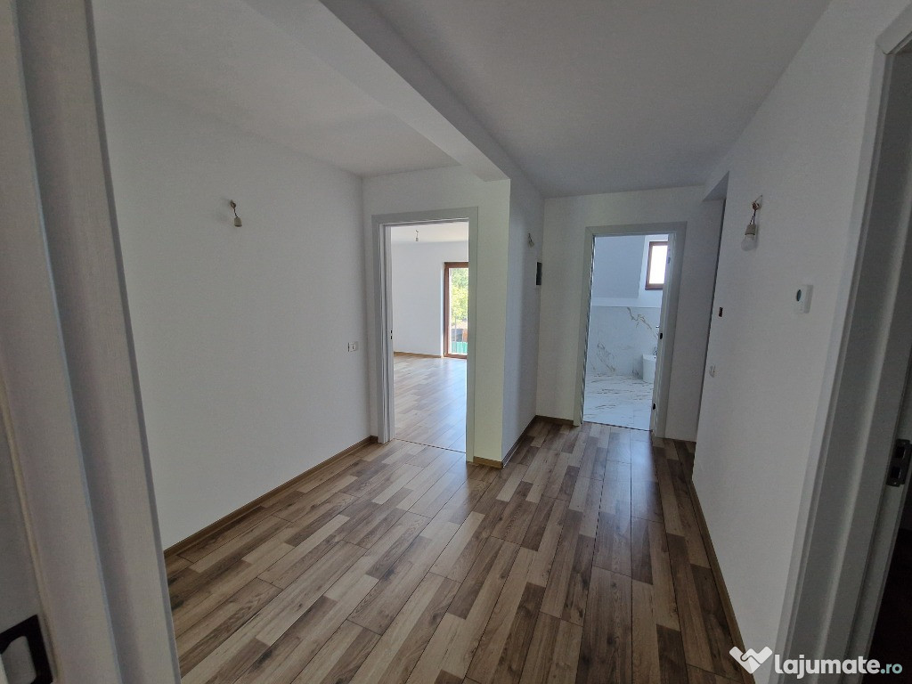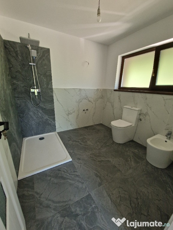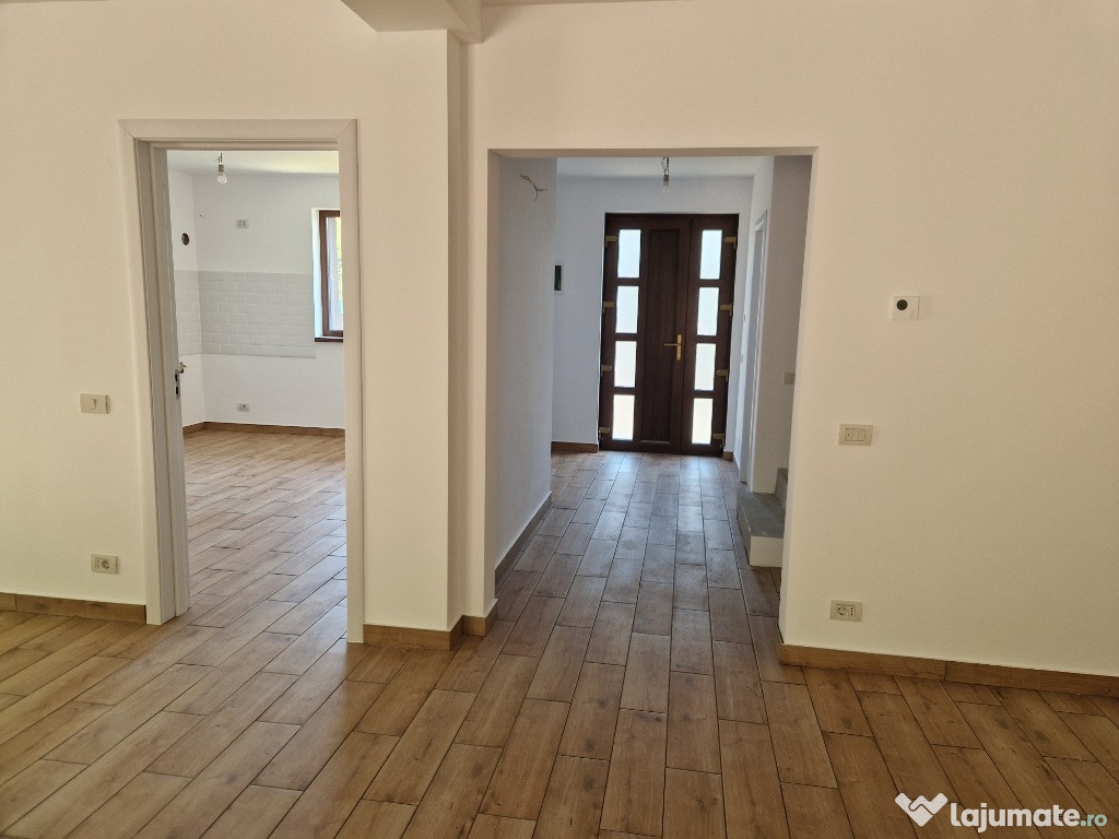 Vila noua cu finisaje deosebite si de calitate superioara in Ghimbav cartier liniștit ,la 2 minute de lidl si 5 min de Metri ,stația de bus la strada principala .Vila este duplex ,fiecare parte este separata cu curte proprie.Este formata din subsol :camera centralei ,camera depozitare,camera gaming/sport ,uscatorie si baie ,la subsol se poate întra si direct din curte ,dar si din casa.Parter format din living spațios cu dining si iesire pe terasa,bucatarie si baie .