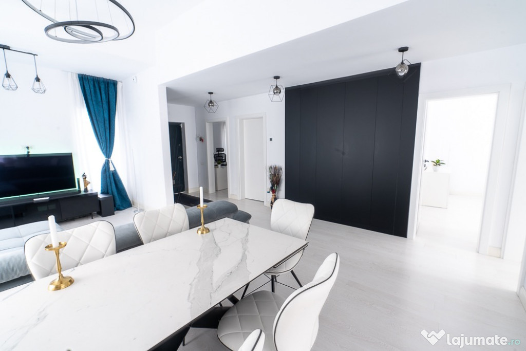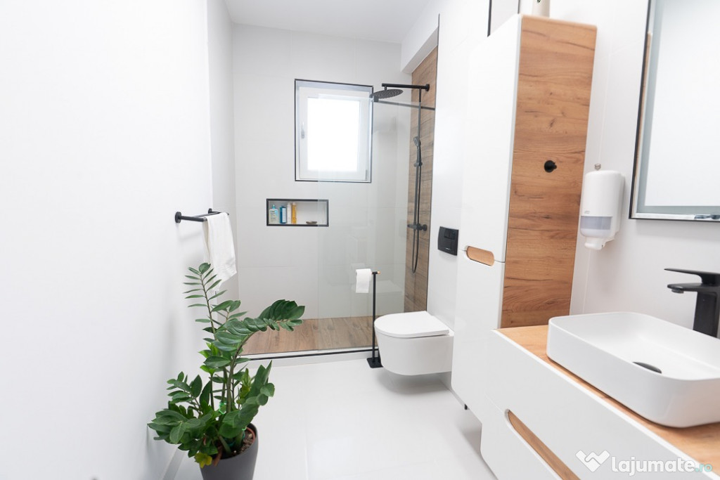 - Bucatarie complet mobilata si utilata: frigider, cuptor electric, plita dubla electric + gaze, hota, masina de spalat vase.