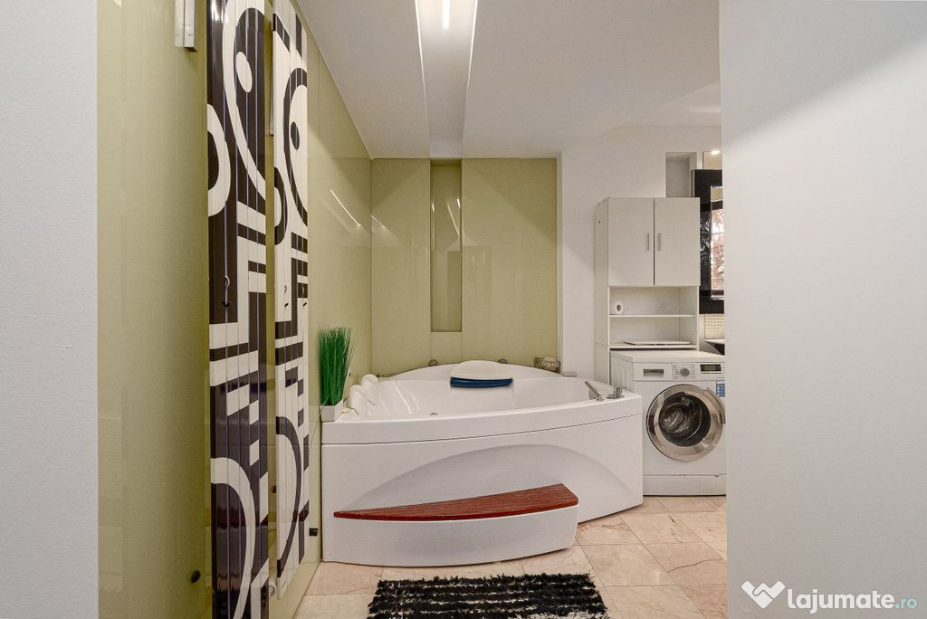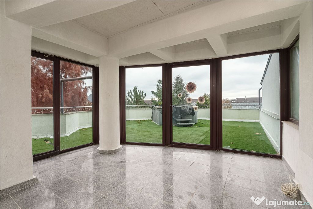 Mansarda este perfecta ca spatiu multifunctional birou, hobby room, avand si o terasa descoperita cu jacuzzi.