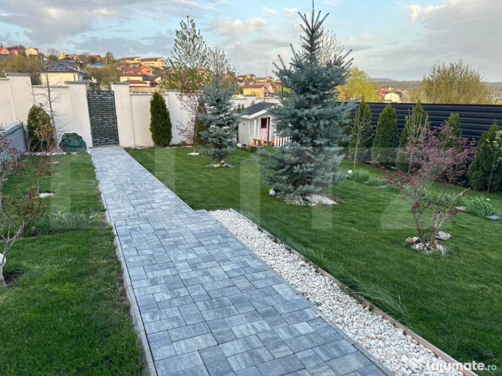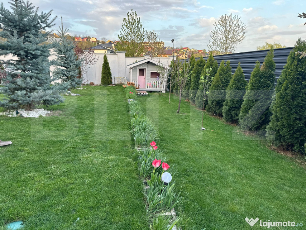 Curtea este una foarte frumoasa, delimitata de un gard solid si de o poarta automatizata, cu parcare betonata si pavata, trotuare flancate de gazon irigat, spatii verzi, plante ornamentale si copaci fructiferi. In spate se gaseste o terasa amenajata si un foisor multifunctional.