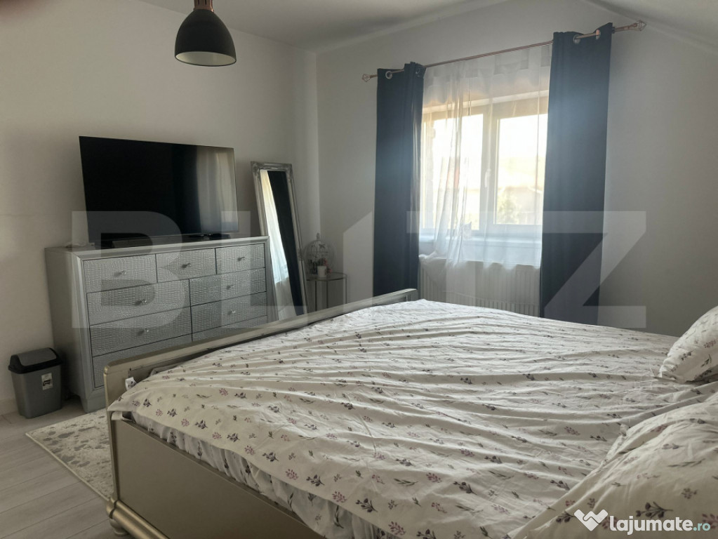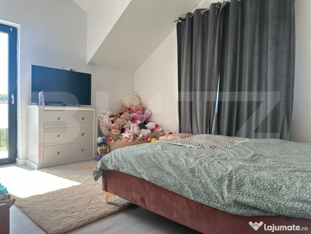 Etaj: dormitor matrimonial (16 mp), dormitor (12 mp), dormitor (11 mp), baie cu cada, hol.