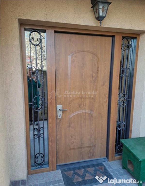 Accesul in locuinta se realizeaza pe o scara cu cateva trepte, o terasa de 6 mp si o usa metalica solida flancata de vitralii.