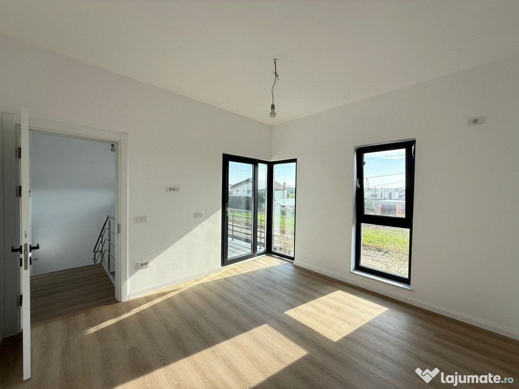 - Parter: living luminos și aerisit, bucătărie separată, baie, cameră tehnică și un dormitor — ideal pentru oaspeți sau birou.